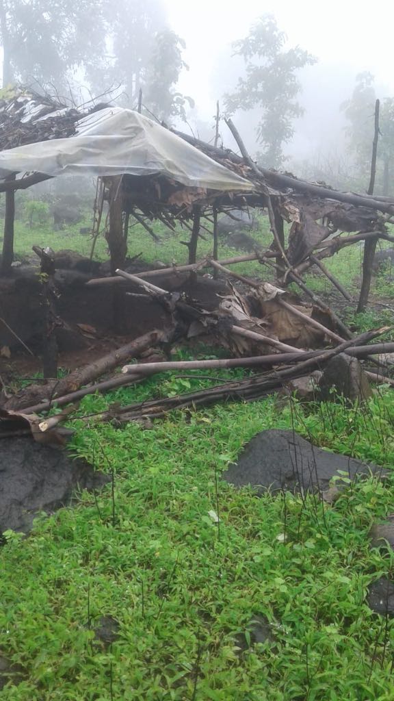 Forest officers kicked this hut to demolish it. (Farmer: Rama Bartan, Chinchwadi)